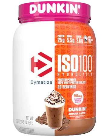 Shop now and experience the ultimate blend of taste and performance with Dymatize ISO100 Dunkin' Mocha Latte Whey Protein.